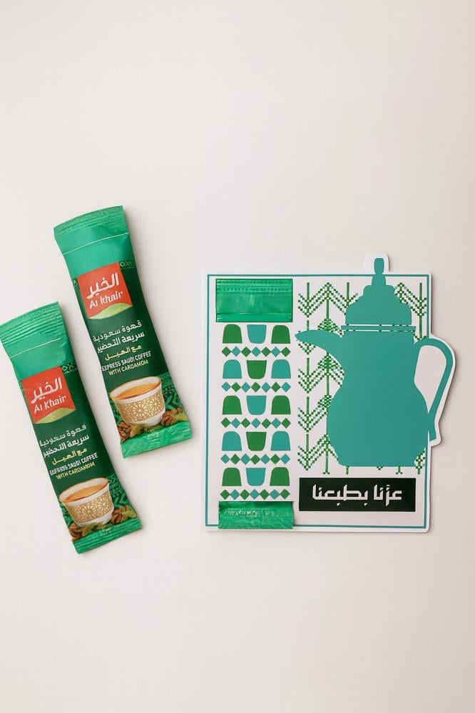 يتم تقديم القهوه داخل ملف ورقي مميز، مما يجعلها جاهزة للتوزيع في المناسبات الوطنية، سواء للطلاب، الموظفين، أو الزوار.