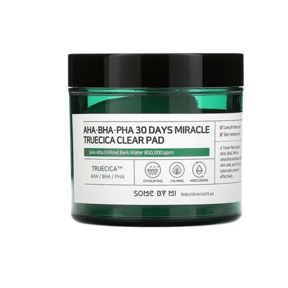مسحات قطنية تروسيكا المعجزة من سوم باي مي 70 قطنة، قطع قطنية ناعمة نقعت بتركيز عالي من مياه جذور الصفصاف 85 % لتنظف البشرة بفاعلية عالية، كما تحتوي على احماض التقشير الطبيعية (ألفا، بيتا، وبولي هيدروكسي أسد ) والتي تزيل الأوساخ، الدهون الزائدة، والخلايا الميتة من المسام بمسحة واحدة. مكونة من سطحين احدهما ناعم والاخر منقوش لتوفر تنظيف عميقا للبشرة. تهدئ البشرة الحساسة والملتهبة.
